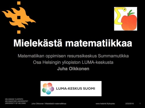 Mielekästä matematiikkaa Posted On 8 joulukuun, 2020 Matematiikan oppimisen resurssikeskus Summamutikka. Osa Helsingin yliopiston LUMA-keskusta. – Juha Oikkonen Summamutikka suomeksi! Matikan ja tilastotieteen sovelluksia esittelevästä Mathversum-virtuaalikerhosta löydät puolestaan tietoa täältä. Tags:Juha oikkonen Related Posts Matematiikkakuvio Matematiikan soveltaminen Matematiikassa kilpaillaan About The Author Kirsi Pääskyvuori